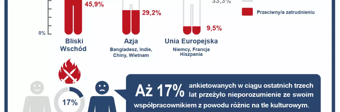 Ponad 17% badanych pracowników firm doświadczyło konfliktu na tle kulturowym w miejscu pracy. Respondenci najbardziej sprzeciwiają się zatrudnianiu pracowników z krajów arabskich i Azji - odpowiednio 45% i 29% badanych jest temu przeciwnych. Najmniej jako współpracowników obawiamy się imigrantów z Unii Europejskiej.