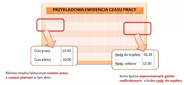 Można też samodzielnie przeliczyć wybrane dni, w których występuje praca nadliczbowa i zgodnie z ewidencją czasu pracy pojawiają się rozbieżności pomiędzy zarejestrowaną w danym dniu pozycją CZAS PRACY, np. 14h, a naliczonym CZASEM PŁATNYM (np. 12h), który jest osobno wykazywany na ewidencji. Dokonanie w ten sposób rekompensaty nadgodzin pozbawia pracownika TYLKO dodatku nadliczbowego, ale nie może pozbawić go normalnego wynagrodzenia. Czas płatny powinien wynosić dokładnie tyle samo, co czas wykonanej w danym dniu pracy. Wykazanie tych brakujących 2h w innym dniu powoduje nieprawidłowe uzupełnienie stawki minimalnej wynagrodzeniem za pracę nadliczbową.