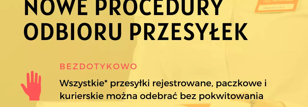 Nowe procedury mają na celu zapewnienie bezpieczeństwa Klientom i Pracownikom. W związku z tym, oprócz tradycyjnej formy doręczenia, wszystkie przesyłki listowe rejestrowane, paczkowe i kurierskie (z zastrzeżeniem przesyłek z dokumentami zwrotnymi) można odebrać bez pokwitowania. W tym przypadku wystarczy okazanie – z bezpiecznej odległości – pracown...