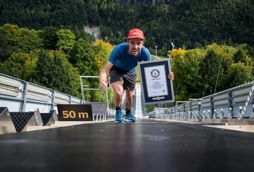 Johannes Ridzek ustanowił pierwszy oficjalny Rekord Guinnessa w 50-metrowym podbiegu na szczyt skoczni narciarskiej o nachyleniu 37 stopni.